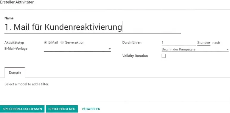 Auch der Aktivität vergeben Sie einen Namen, z. B. „1. Mail für Kundenreaktivierung“.