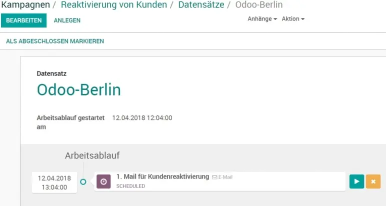 Der Name ist ein wenig irreführend, denn Sie können neben zielgerichteten Kampagnen, z. B. einleitende E-Mails beim Anmelden an Leads oder Rabattmails an bestehende Kunden, auch automatisierte Zahlungserinnerungen (Odoo-Finanzbuchhaltung) oder Buchungsbestätigungen (Odoo-Eventmanager) versenden. Die App dient folglich vorrangig zum Versand von automatisierten E-Mails. Es können aber ebenfalls automatisierte Aktionen, wie beispielsweise im Bereich CRM die Bewegung eines Leads in Ihrem Verkaufstrichter, ausgeführt werden. Man könnte die App also auch als Odoo Business Automatisierung bezeichnen.